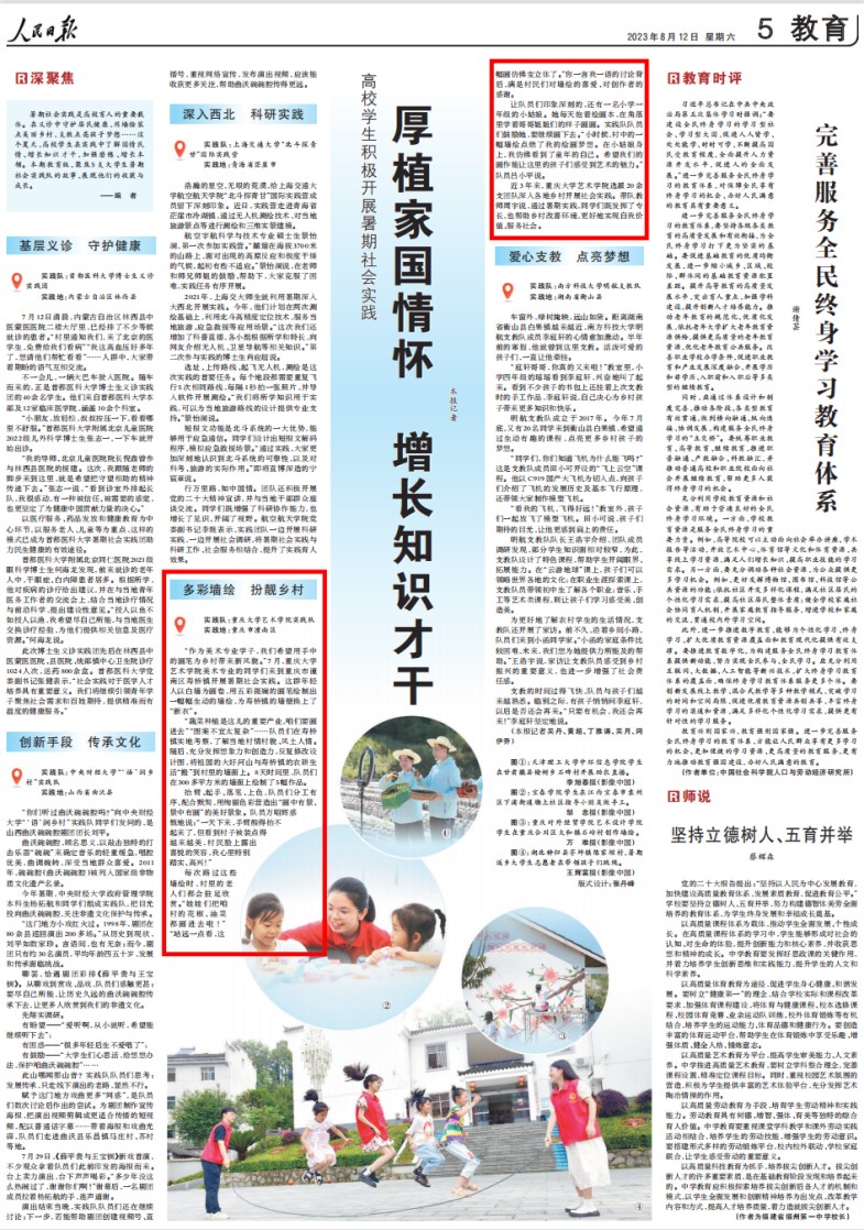 2023年8月12日,《人民日报》教育专栏以《厚植家国情怀 增长知识才干》为题,报道了全国暑期大学生社会实践活动,其中以《多彩墙绘,扮靓乡村》为主题介绍了污污漫 实践队2023年7月16日至7月21日在重庆市潼南区寿桥镇开展的乡村振兴墙绘实践活动。 *污污漫 历来重视实践育人工作,教育引导学生在社会实践中厚植家国情怀、了解国情民情、增长知识才干、激发挺膺担当。20...
